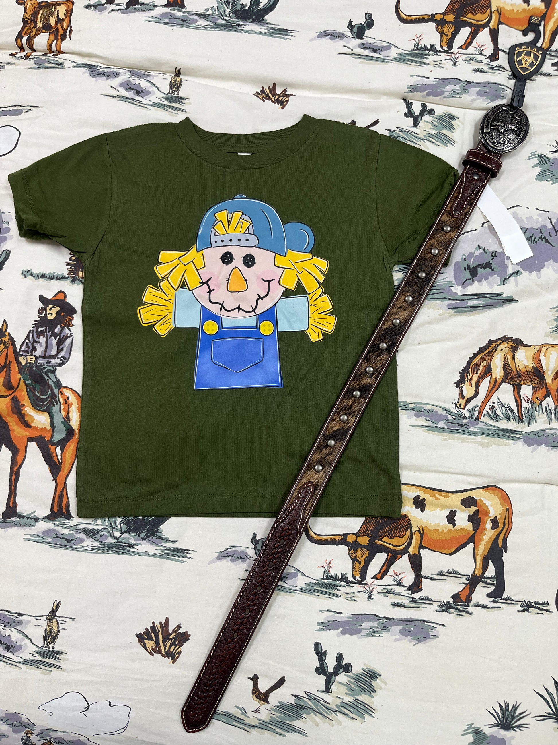 LITTLE SCARECROW BOY ON AN OLIVE BELLA CANVAS TEE CAN ADD A NAME TO PERSONALIZE