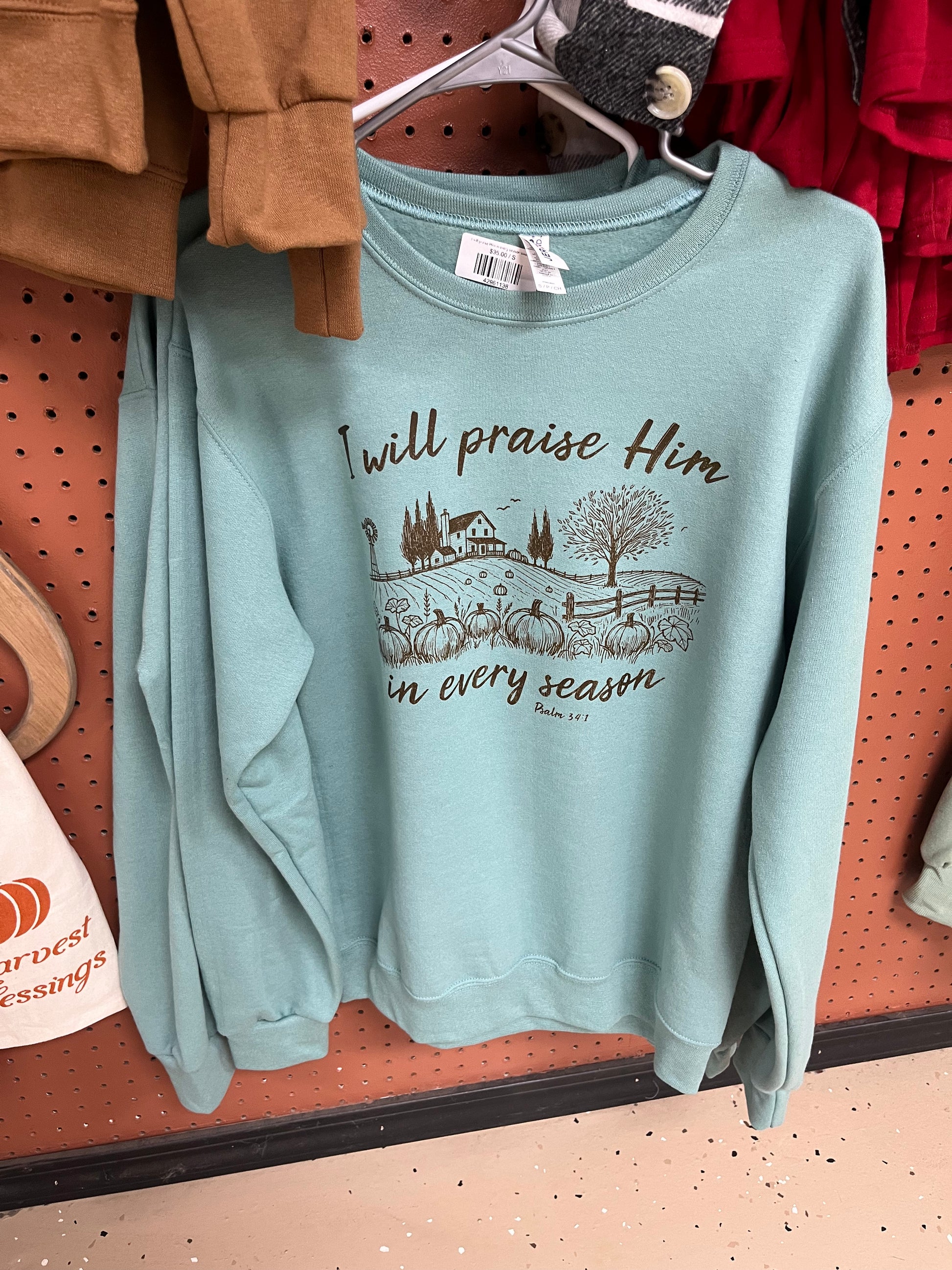 I will praise Him in every season featuring pumpkins to get you in the fall spirit. The design is brown and is featured on Jerzees sage sweatshirt.