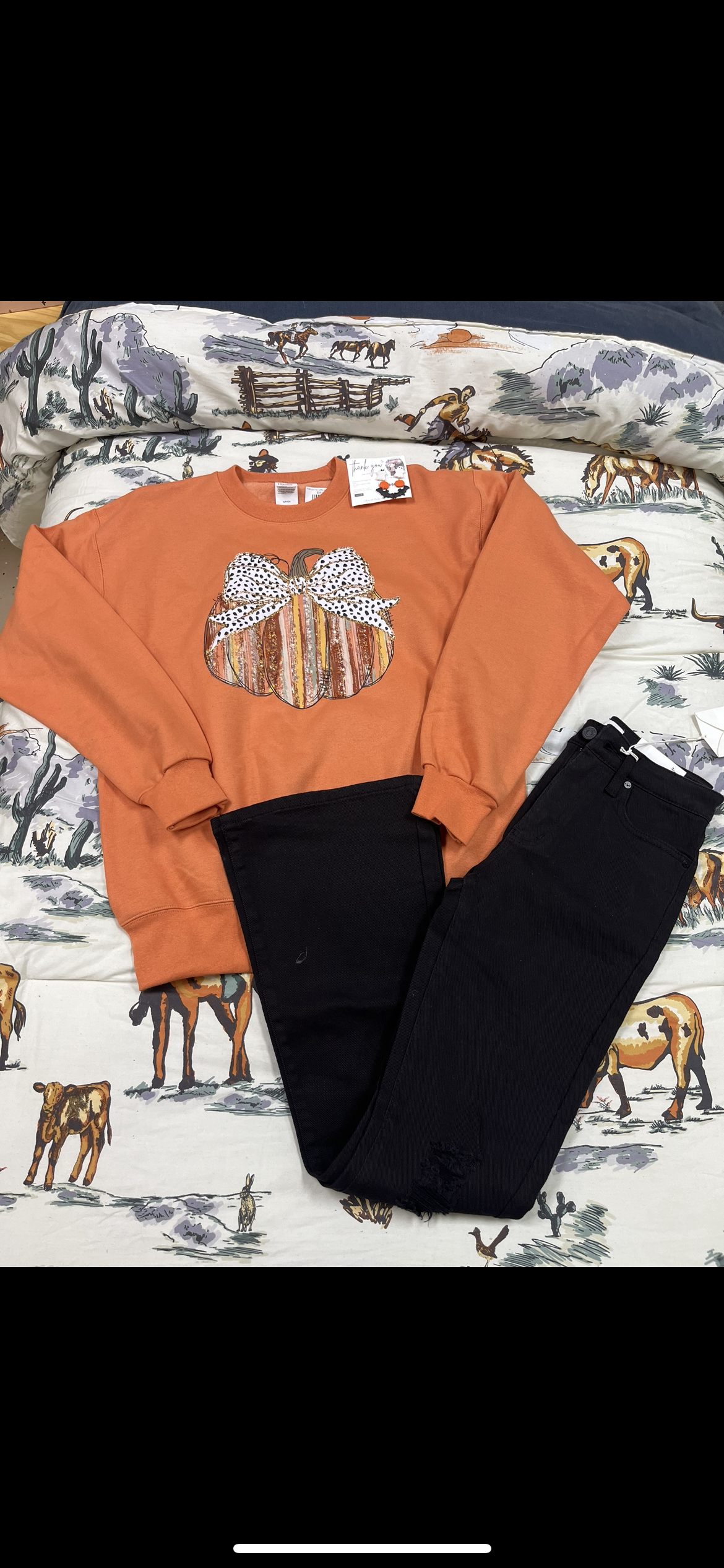 Such a fun design on a pumpkin colored hanes sweatshirt.